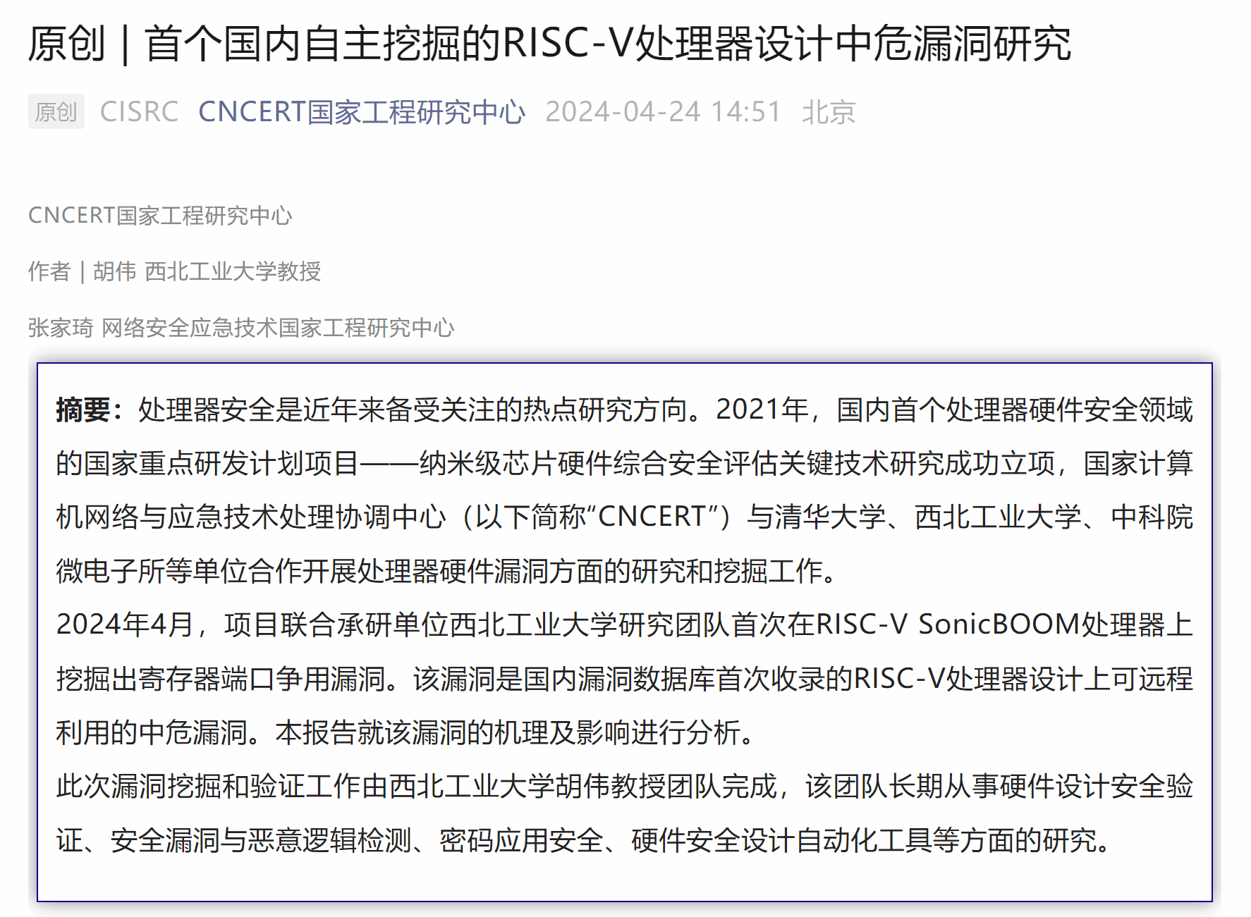 近日,国家计算机网络与应急技术处理协调中心(CNCERT)传来喜讯,专题报道公司2026年国际足联世界杯胡伟教授团队在RISC-V SonicBOOM处理器设计中挖掘出中危漏洞。这是国内首个自主挖掘的RISC-V处理器设计上可远程利用的中危漏洞,也是国内首个处理器硬件安全领域国家重点研发计划项目——纳米级芯片硬件综合安全评估关键技术研究的重要进展。