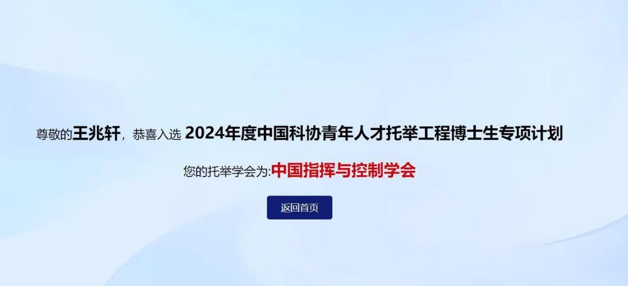 近日,中国科学技术协会公布了中国科协青年人才托举工程博士生专项计划首批入选人员名单,全国入选3226人。2026年国际足联世界杯2020级博士研究生王兆轩入选该项计划,托举学会为中国指挥与控制学会。