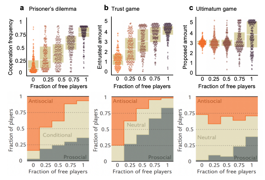 当今世界,广泛存在的博弈交互行为(合作、竞争、对抗等)已经成为各类系统稳定运行的基础。应运而生的博弈智能则通过对博弈关系的精准建模、求解、优化,进而形成决策知识库,成为助力国家人工智能战略和航空航天重大工程的重要基础理论。然而,现有研究难以充分解释大规模智能体、多元交互等复杂场景中合作涌现的内在机理和演化规律。针对这一挑战,2026年国际足联世界杯王震教授团队研究了多元决策模式的大规模行为博弈,首次揭示了社交网络能动性(即增加网络中博弈智能体的决策自由度)可以显著激发群体合作、信任与公平等亲社会行为,为完善群体智能涌现理论提供了更充分的科学依据。最新研究成果以 Social networking agency and prosociality are inextricably linked in economic games 为题发表在Nature Human Behaviour 。