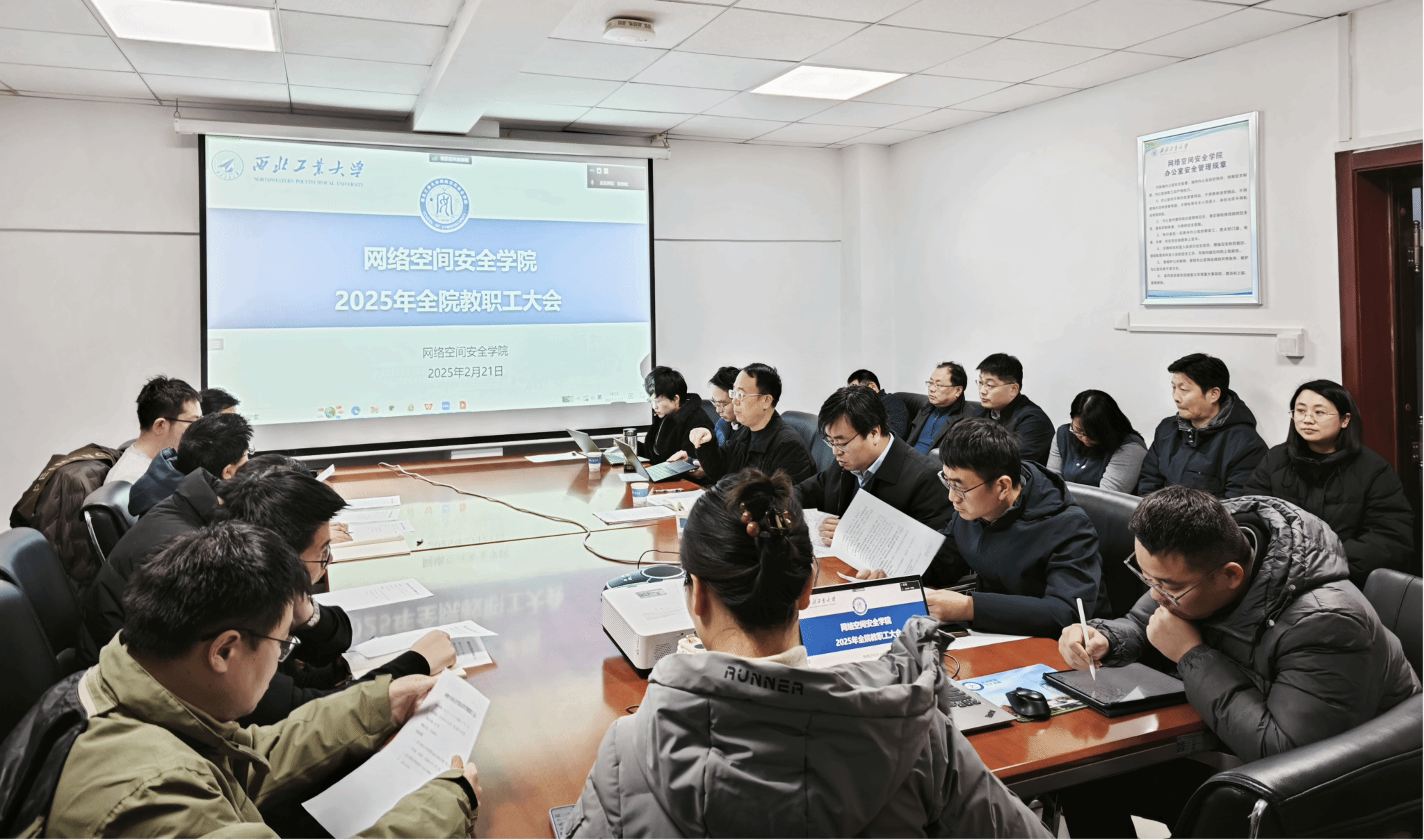 最后,王震经理对会议进行了总结并对新学期重点工作进行了部署。他强调过去的一年在全院教职工的共同努力下公司取得了很好的发展成效,但对照“127”发展目标还存在一定的差距。新的一年,全体人员要切实落实公司“高质量、高水平、高速度”的发展要求,继续保持“永远在一线、永远在状态、永远在前列”的工作状态,紧盯公司目标责任,谋大事、干实事、解难事。要重点在网安“总师型”人才培养、国家级人才引育、大项目大平台争取、高水平竞赛获奖等方面下大功夫,提前做好谋划,全院师生要凝聚在一起,推进一流2026年国际足联世界杯“高质量、高水平、高速度”建设发展,为实现公司“127”发展目标和“天下工大、世界三航”远景目标贡献“网安人”力量。