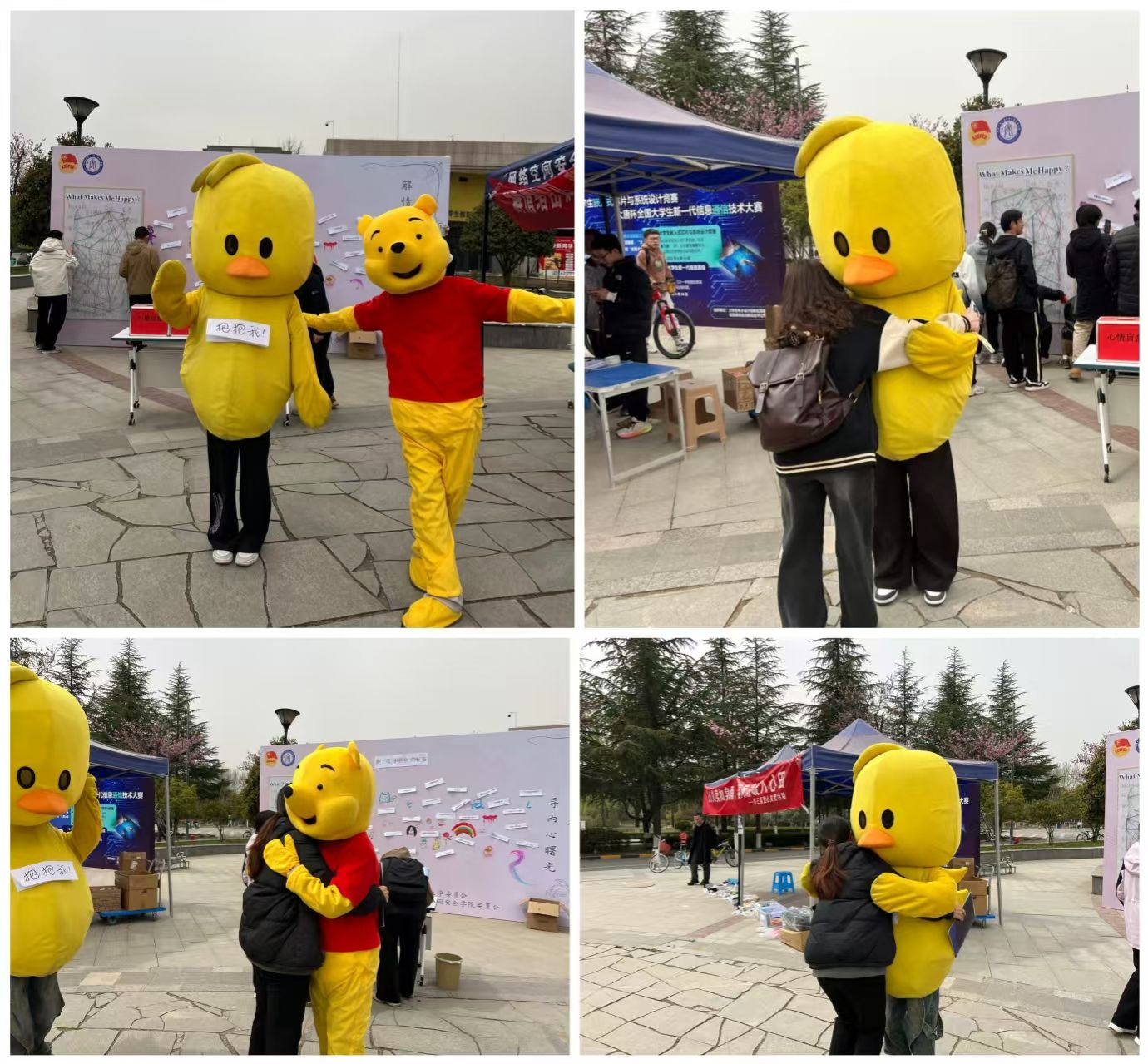 我们的志愿者化身软萌玩偶,随时待命!当他们面向参与者张开双臂,收获的不仅是惊喜的尖叫,更有参与者泛着泪光的倾诉。有位同学紧紧抱住玩偶说:"这是我今天得到的第一个拥抱,谢谢你,让我觉得自己不再孤单。" 刹那间,过去的痛苦与压力,烦躁与落寞也随着那一个个比春日阳光更加温暖的拥抱,烟消云散。玩偶服下,志愿者们用自己的温度,为大家传递着无声的支持。