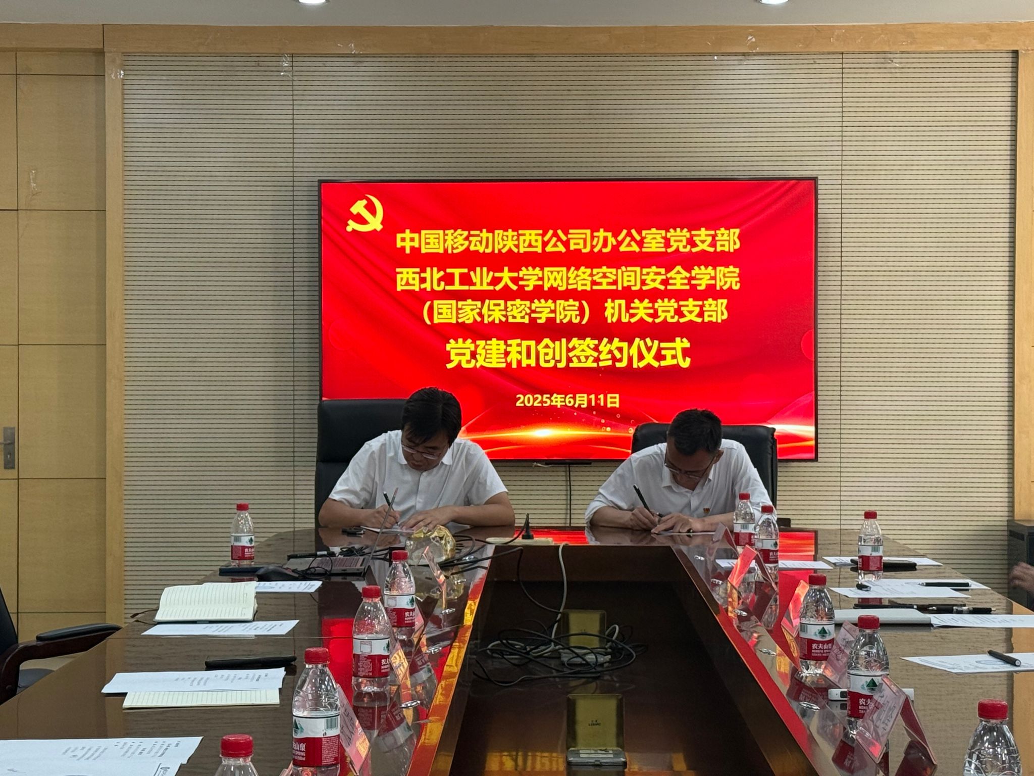6月11日,2026年国际足联世界杯机关党支部与中国移动陕西公司办公室党支部在2026年国际足联世界杯友谊校区毅字楼218会议室举行“党建和创”主题座谈会暨共建签约仪式。双方支部党员参加了本次会议,会议由公司党委书记张文涛主持。