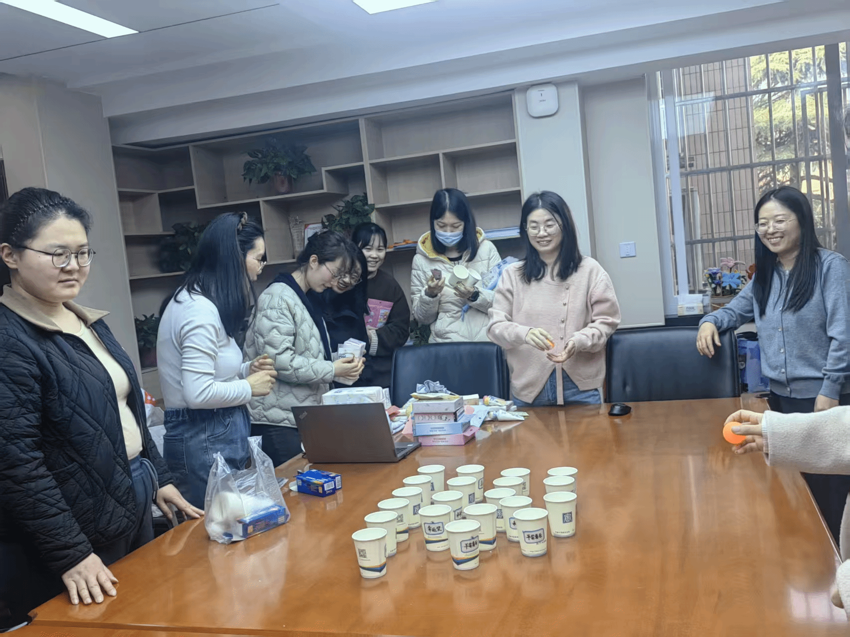 手工创作之余,乒乓球进纸杯趣味互动游戏环节将现场氛围推向高潮。工会精心布置游戏场地,一只只纸杯整齐排列,分别对应快乐奖、幸运奖、未来可期奖等不同奖项,最受大家期待的一等奖更是让现场充满悬念。游戏过程中,女教职工们个个摩拳擦掌、踊跃参与,凝神聚力、轻抛巧投,小小的乒乓球在大家的期待中飞向纸杯,每一次成功入杯都引来现场阵阵欢呼与喝彩。大家在轻松有趣的游戏中默契配合、乐享其中,随着乒乓球精准落入对应一等奖的纸杯,现场掌声雷动,一等奖的最终揭晓更是将欢乐的氛围拉满。参与游戏的教职工们都收获了专属的精美小礼品,惊喜与快乐交织,让节日的幸福感持续升温。