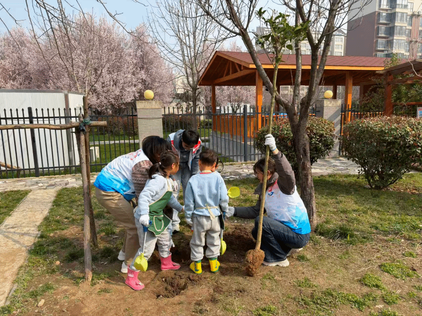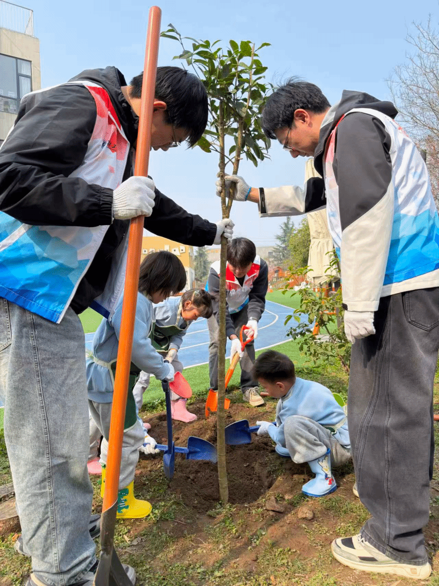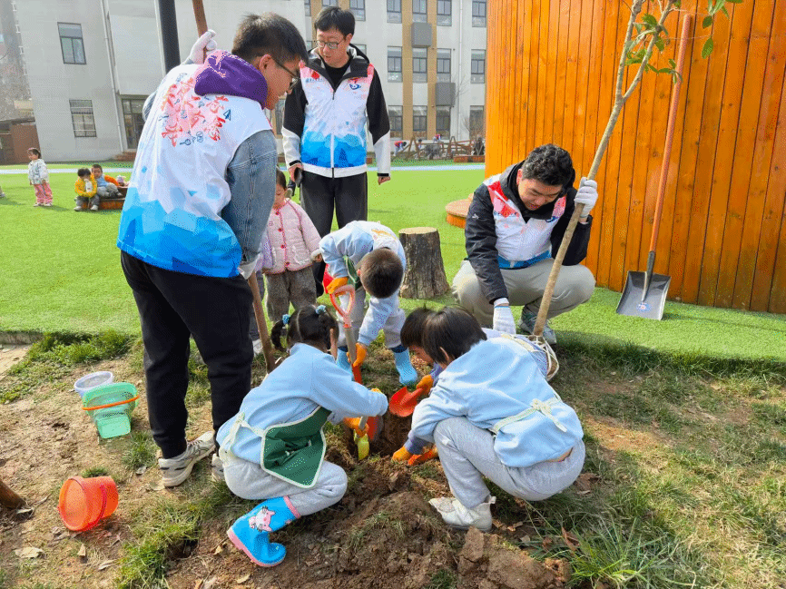 宣传教育活动结束后,大家移步至幼儿园户外区域,开启植树护绿实践环节。幼儿园小朋友与老员工志愿者、配班教师分为六组,分工协作、干劲十足。种植完成后,志愿者们带领小朋友们仔细观察亲手栽种的小树苗,重申“爱护小树、定期浇水、不摇晃、不伤害”的护绿约定,引导小朋友们在劳动中践行环保责任,在协作中体会雷锋实干精神,让“奉献、友爱、互助、进步”的志愿精神与生态环保理念深度融合。