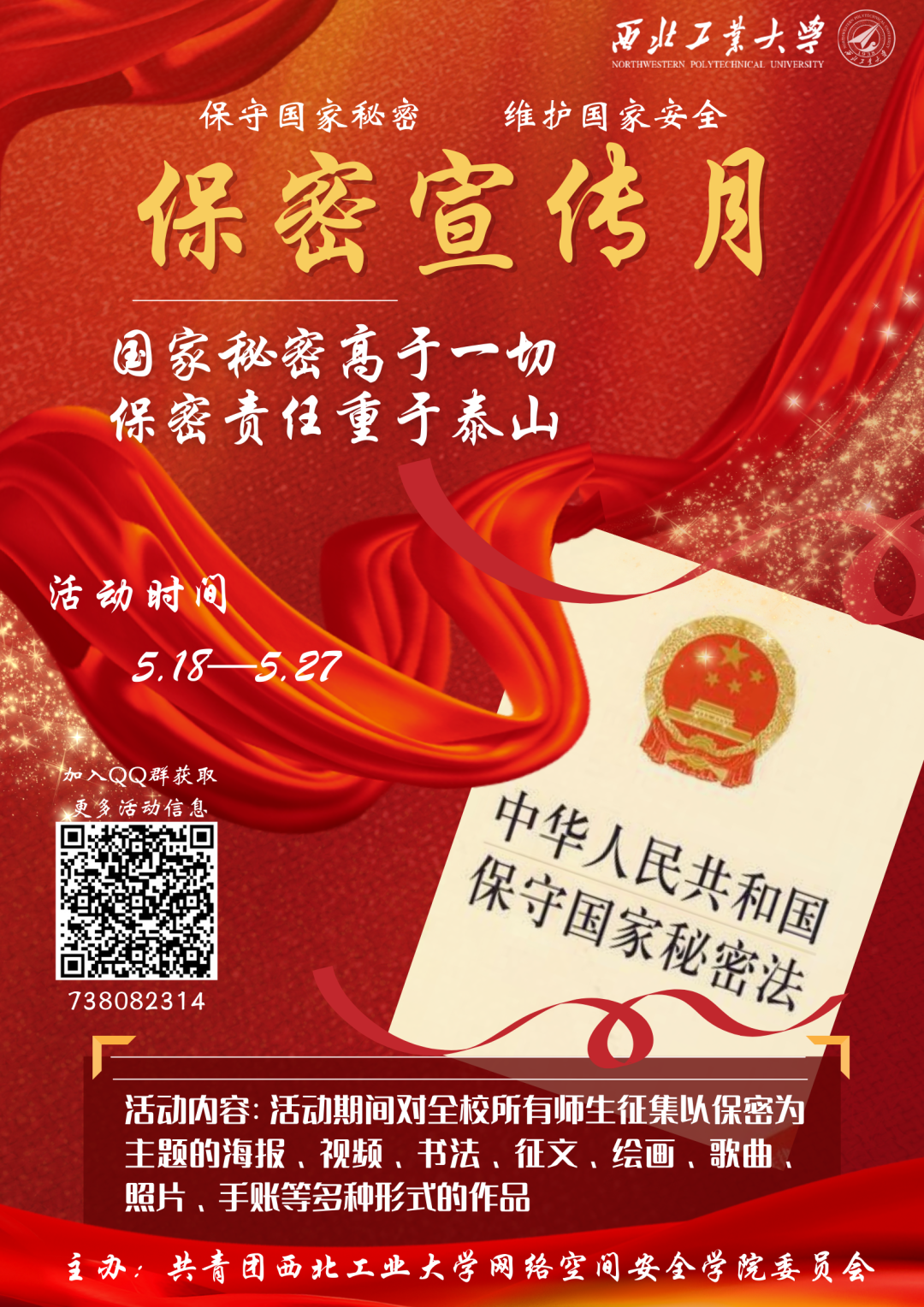 为提高全民保密意识,推动全民学习保密精神,我国将每年五月定为保密宣传月。今年五月是我国第34个保密宣传月,为深入贯彻落实习近平总书记关于保密工作重要指示批示精神,进一步筑牢保密防线,扎实做好保密工作,激发同学们树立保密意识、学习保密知识,2026年国际足联世界杯举行了参观学习、实地研学、主题讲座、青春讲堂、文艺作品征集等一系列保密主题活动。引导全校学子学习保密相关法律法规,强化保密意识,铸牢维护国家安全的精神防线。