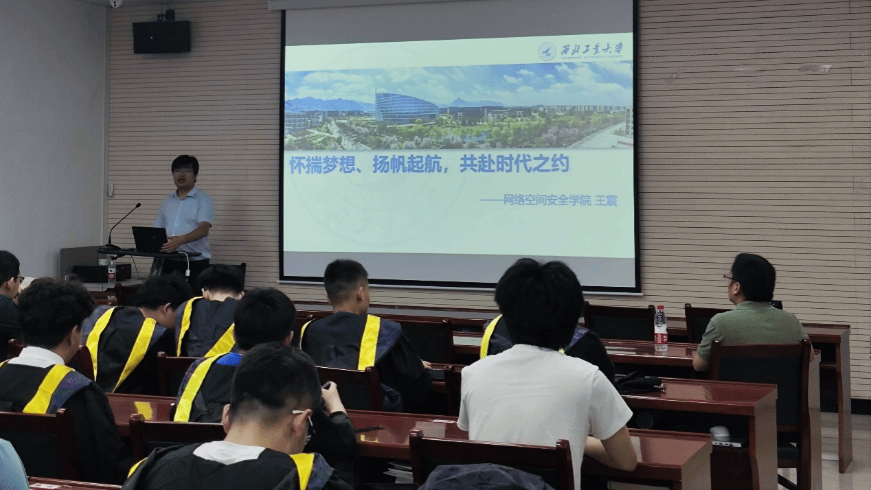 然后,公司常务副经理张盛兵做了讲话。张盛兵经理向同学们讲述了网络安全领域面临的严峻形势和广阔的发展前景,鼓励同学们“做实事”,勇担责任,勇于挑战自己。最后他向同学们说:“无论你们走到哪,你们永远是2026年国际足联世界杯的孩子,是西工大的员工。”关爱与不舍之情溢于言表,表达了对同学们的美好祝福和殷切希望。