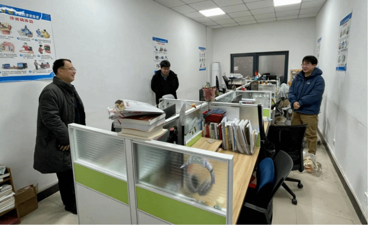 2月3日,经理王震、党总支书记张文涛、副书记杜瑶一行赴长安校区看望寒假留校员工,并对公司楼机房、会议室、研习室、办公室、图书角等公共区域进行安全检查。辅导员王昌昌、戚明平等陪同参加。