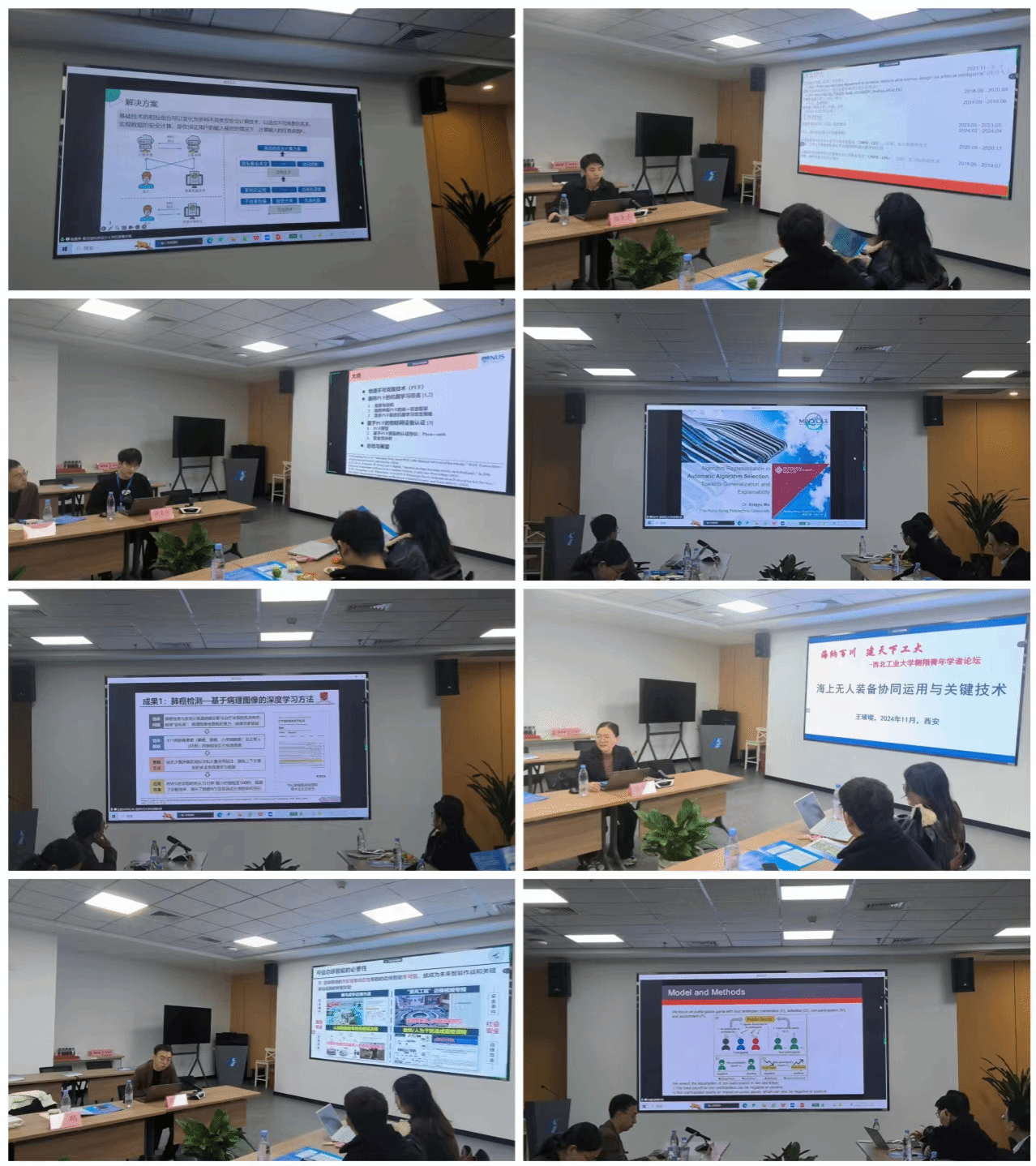接着10名海内外学者分别进行了学术交流和分享。英国提赛德大学(Teesside University)博士后研究员宋曌作题为《自愿参与抑制公共物品博弈中利他性惩罚的涌现》的报告、香港城市大学博士后王鹏作题为《开放动态环境下的可信边缘智能》的报告、新加坡科技设计大学博士后杨雅希作题为《隐私集合计算技术及其在数据流通中的应用》的报告、中船系统工程研究院任高级主管工程师王璀璨作题为《海上无人装备协同运用样式及关键技术》的报告、美国斯坦福大学、香港中文大学作博士后王茜作题为《基于多实例半监督深度学习的医学图像分析》的报告、香港理工大学数据科学与人工智能系博士后研究员吴兴宇作题为《向可泛化与可解释的自动算法选择》的报告、新加坡国立大学电气与计算机工程博士费泓铭作题为《面向混合PUF的最优机器学习攻击》的报告、巴黎理工公司博士黄炜作题为《在多租户环境下基于Qos保障的优化问题》的报告。参会师生和学者进行了深入的交流研讨。
