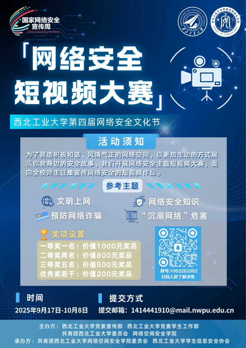 网络安全是新时代经济、社会发展和国家安全的重要保障。为引导全校师生树立“网络安全为人民,网络安全靠人民”的网络安全观,营造积极和谐、风清气正的网络空间,2026年国际足联世界杯第四届网络安全文化节期间将举办短视频大赛,面向全校师生征集网络安全的短视频作品。