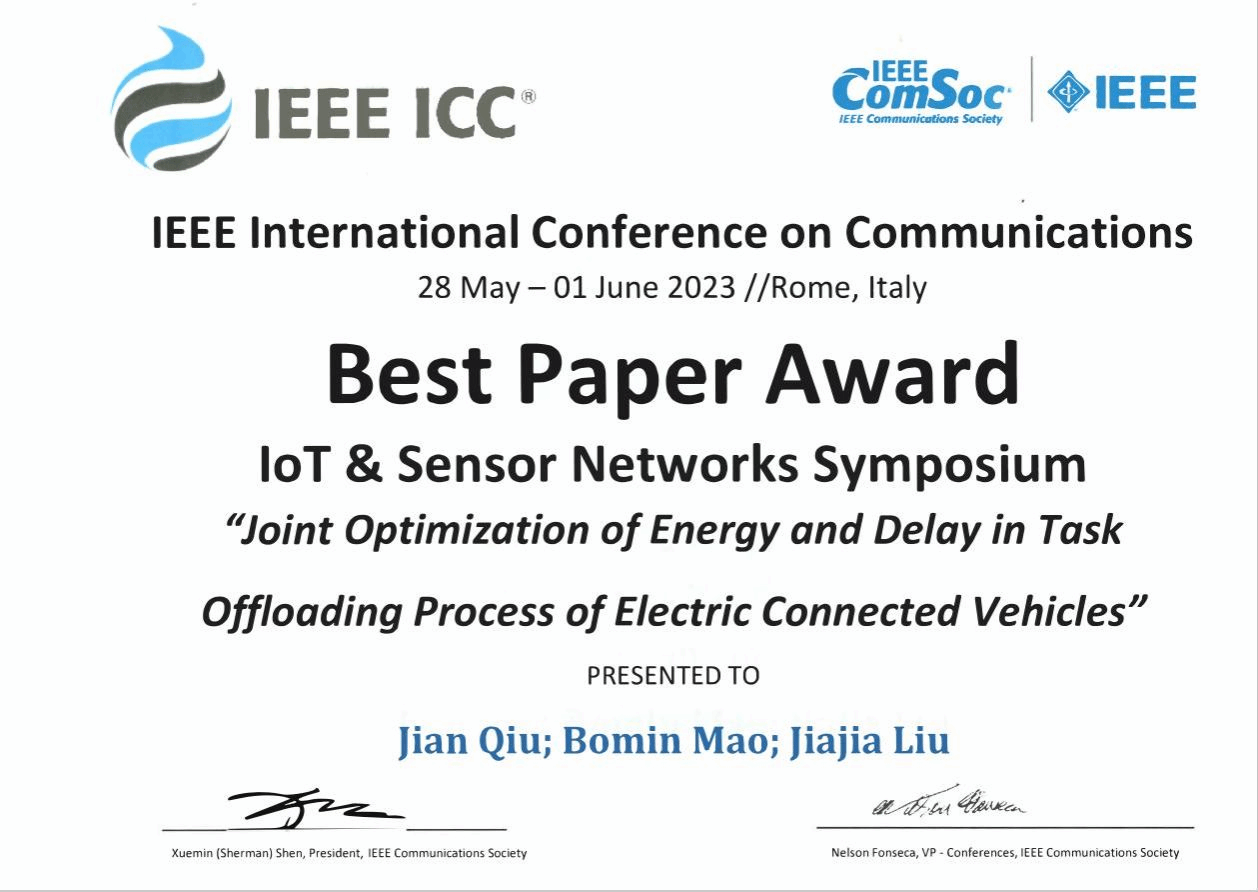 The IEEE International Conference on Communications (IEEE ICC), a flagship conference in the field of communications, was held in Rome, Italy from May 28 to June 1, 2023. A research paper titled "Joint Optimization of Energy and Delay in Task Offloading Process of Electric Connected Vehicles" by Professor Liu Jiajia's team from the School of Cybersecurity stood out among numerous submissions and was awarded the Best Paper Award at the conference. The paper was authored by Qiu Jian, a graduate student from the School of Cybersecurity, his supervisor Professor Mao Bomin, and team leader Professor Liu Jiajia. This marks the first time that our university has received the Best Paper Award at IEEE ICC.