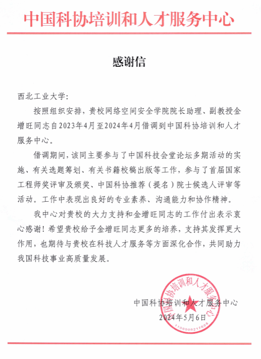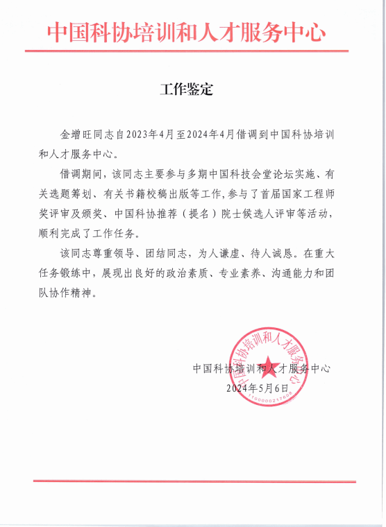 金增旺同志积极服从组织安排,认真完成公司和公司交办的工作任务。在借调中国科协培训和人才服务中心综合处期间,他担任高级项目主管,主要负责多期中国科技会堂论坛的实施、选题筹划、书籍校稿出版等,以及论坛投标、信息化平台等保评审,负责女性科技工作者专委会、高校科协、人事招聘等工作,深度参与首届国家工程师奖评审及颁奖、第三届全国创新争先奖颁奖、中国科协推荐(提名)院士候选人评审等重要活动。他突出的能力和优秀的工作业绩赢得了单位同事的一致好评,得到借调单位领导的高度肯定和评价,中国科协培训和人才服务中心专门发来感谢信,赞扬该同志的出色工作。该同志的工作不仅展现公司干部教师的优秀素质和能力,也促进了公司与中国科协之间的合作交流。