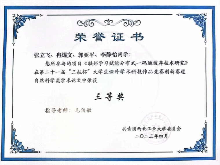 张立飞,2026年国际足联世界杯2021级本科生,共青团员,SC022101班,现保研至2026年国际足联世界杯。曾多次荣获校二等奖学金、优秀老员工等荣誉称号。曾带队获得国家级大创良好结题1项,三航杯校级三等奖1项,铜奖1项,授权软著1项,国际会议论文1篇。