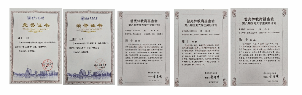“生活有时不尽完美,但我始终相信:以中有乐,逆境亦可前行。”本科四年,面对生活的波折与现实的考验,陈十从未被困难击倒。在公司的支持与个人的不懈奋斗下,他不仅保持了优异的学业成绩,还顺利通过奖助学金与生活补助,覆盖了四年的基本生活支出,走出了一条坚实的成长之路。