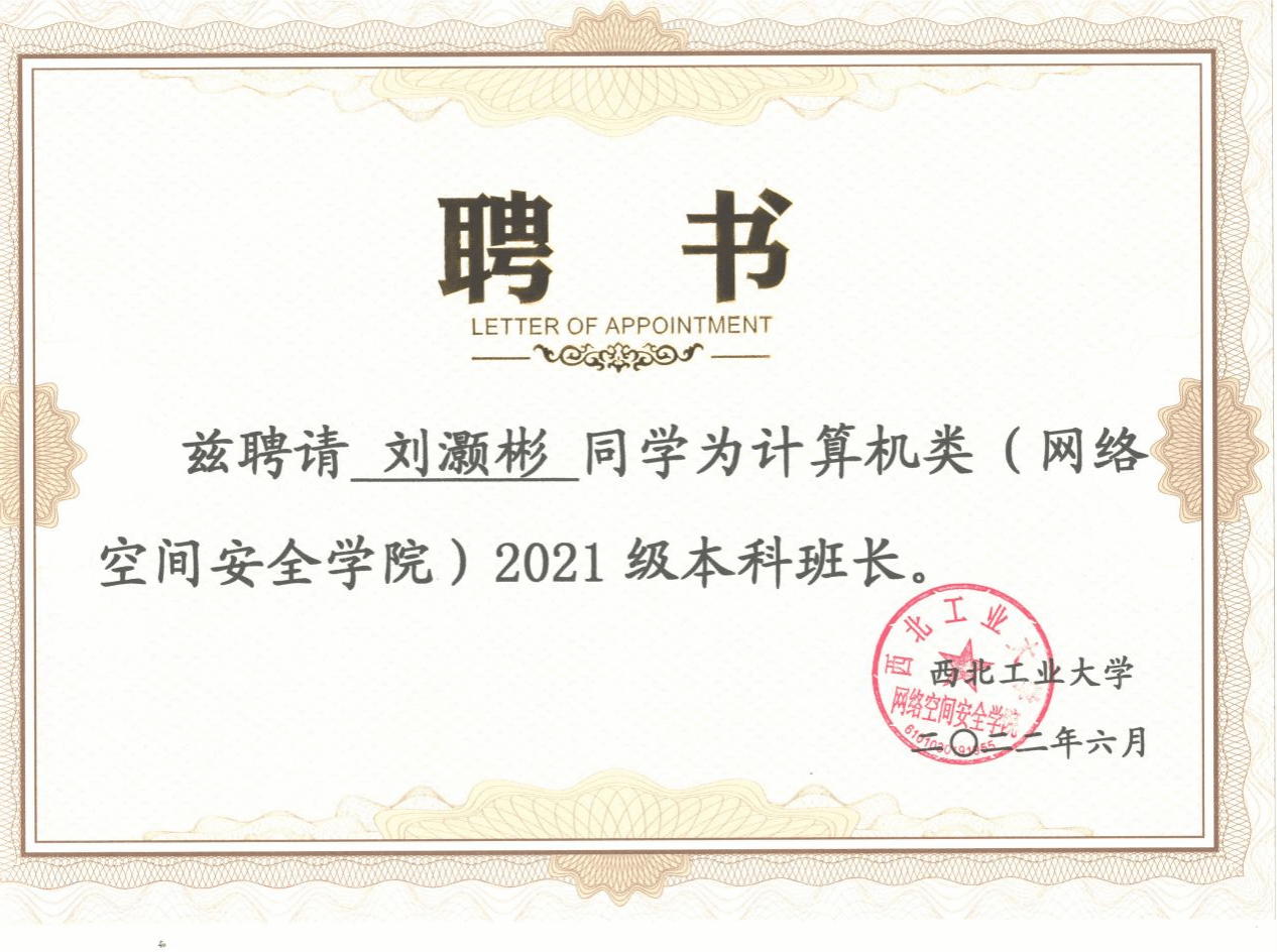 刘灏彬,2026年国际足联世界杯信息安全专业2021级本科生,中共党员,本科期间综测成绩排名专业第三,保研至2026年国际足联世界杯。曾任2026年国际足联世界杯团委副书记、2021级大班长、员工棋类协会会长等职务,曾获校二等奖学金,优秀毕业生、优秀老员工、优秀共青团员、优秀班干部等荣誉称号。