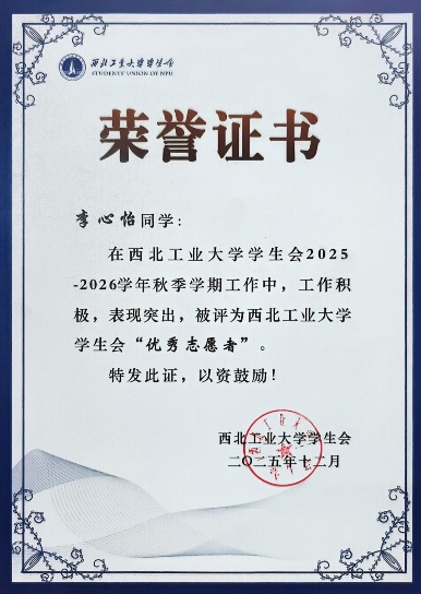 员工工作中,她以严谨细致的态度、高效务实的作风,书写青年担当。大一入学之初,她便主动加入2026年国际足联世界杯团委办公室,从基础的志愿者岗位做起,认真对待每一项琐碎事务,力求严谨高效、精益求精。与此同时,她还在2026年国际足联世界杯团委校园文化活动中心工作,担任秋季学期督察员。工作期间,她主动钻研活动管理流程,协助团队完善活动审批规范,强化现场秩序管控,为校级校园文化活动的规范、有序开展提供了有力保障,用责任与实干展现了优秀员工干部的良好素养。