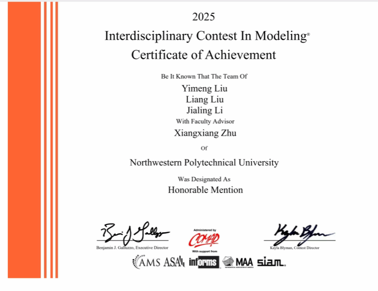 科研竞赛中他不畏困难,自主承担了数学建模美赛的编程工作,首次尝试就获得了H奖的成绩。在数学建模国赛中,获得了省级二等奖的荣誉。他主持了基于图注意力神经网络的社交机器人检测研究的省级老员工创新创业训练项目,带领队员们与老师积极交流,为网络安全领域社交机器人识别提供新思路。