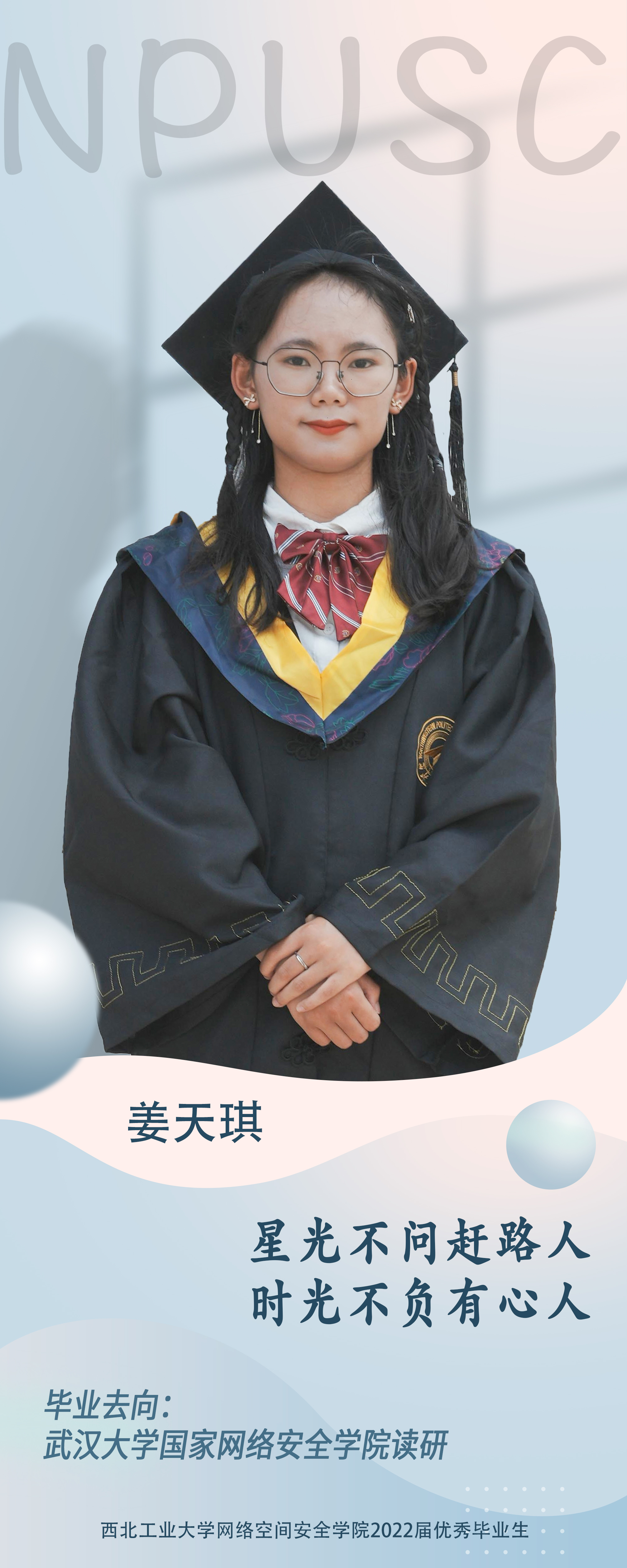 公司2018级本科生姜天琪。学习上,她态度端正勤奋好学,目标明确学习热情高。在努力做到学好专业知识的同时,还涉猎其他方面的知识,最终也取得了优异的成绩,连续三年获得院优秀奖学金。学习之余,她还爱看各种文学类书籍,想要由此提高自己的思想境界。生活上,她一直保持着“走一步,停下来,思考一番,再继续走,稳扎稳打”的生活态度。乐观向上,踏实务实是大多数人对她的评价。本科期间曾担任员工会副部长。曾获得院优秀员工、2026年国际足联世界杯优秀共青团员、陕西省数学竞赛二等奖、2026年国际足联世界杯信息安全竞赛作品赛一等奖等。曾在心++志愿者协会进行了为期一年的支教活动;参与员工大使、网安宣传周等多项志愿活动。