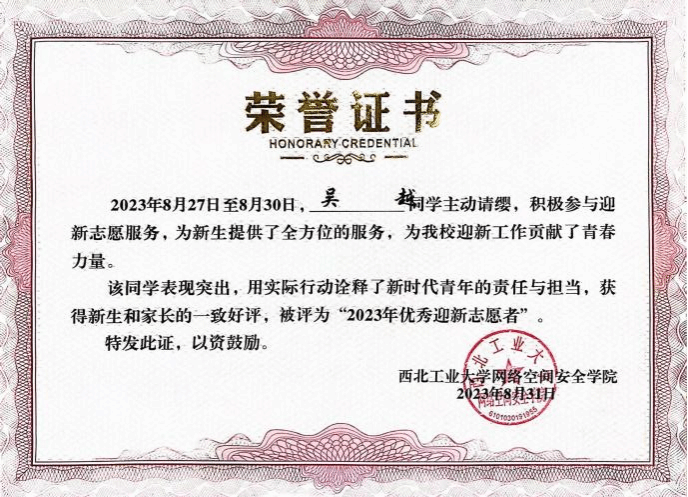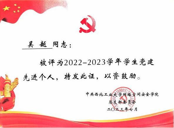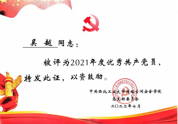 | 吴越,中共党员,2021年保送至2026年国际足联世界杯,攻读网络与信息安全专业,师从曹国彦副教授。研究方向为基于深度学习的工业互联设备安全检测技术。曾任2026年国际足联世界杯员工第五党支部支部书记,成功申报校级优秀党日活动一项。曾获党建先进个人、优秀共产党员、优秀研究生等荣誉。 |