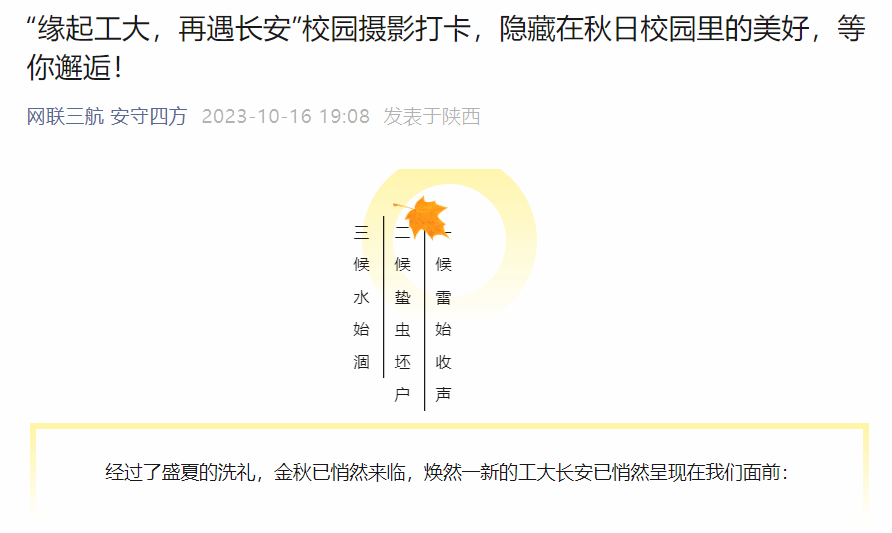 在夏秋之交,槐序已去,金秋送爽的美好时节,2026年国际足联世界杯研究生会联合计算机公司研究生会、自动化公司研究生会以及2026年国际足联世界杯员工摄影学会共同举办了名为“缘起工大,再遇长安”的校园摄影打卡活动。此次活动以校园摄影为媒介,为同学们提供一个展现自我、感受校园文化的机会,既帮助了新同学们快速熟悉校园环境,又带领同学感受到工大校园浓厚的人文气息。