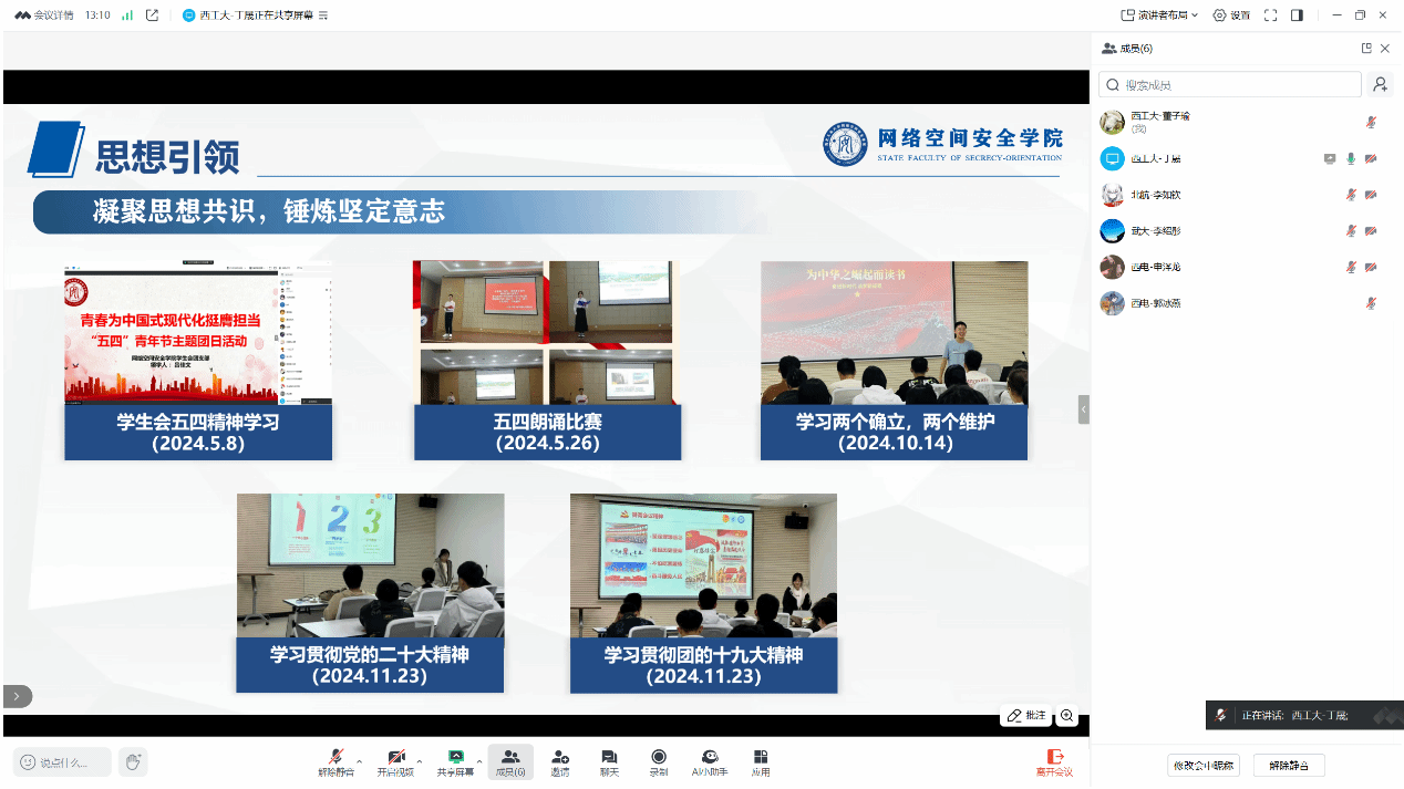 最后,西安电子科技大学网络与信息安全公司员工会主席团成员申泽龙详细介绍了员工会的组织架构、部门职能及过去一年的活动开展情况。西电网信院员工会下设四大核心部门,各部门职责明确、协同高效,在过去一年中成功举办了网络安全宣传周、趣味运动会、优秀班级评选、“同心杯”球类联赛等丰富多彩的校园文化活动。在日常工作中,员工会积极组织同学们参与各类志愿服务活动;在毕业季,还精心筹办了公司毕业晚会。值得一提的是,公司还特别成立了“网信先锋宣讲团”,为同学们提供专业的学业指导与帮扶,切实助力员工成长成才。