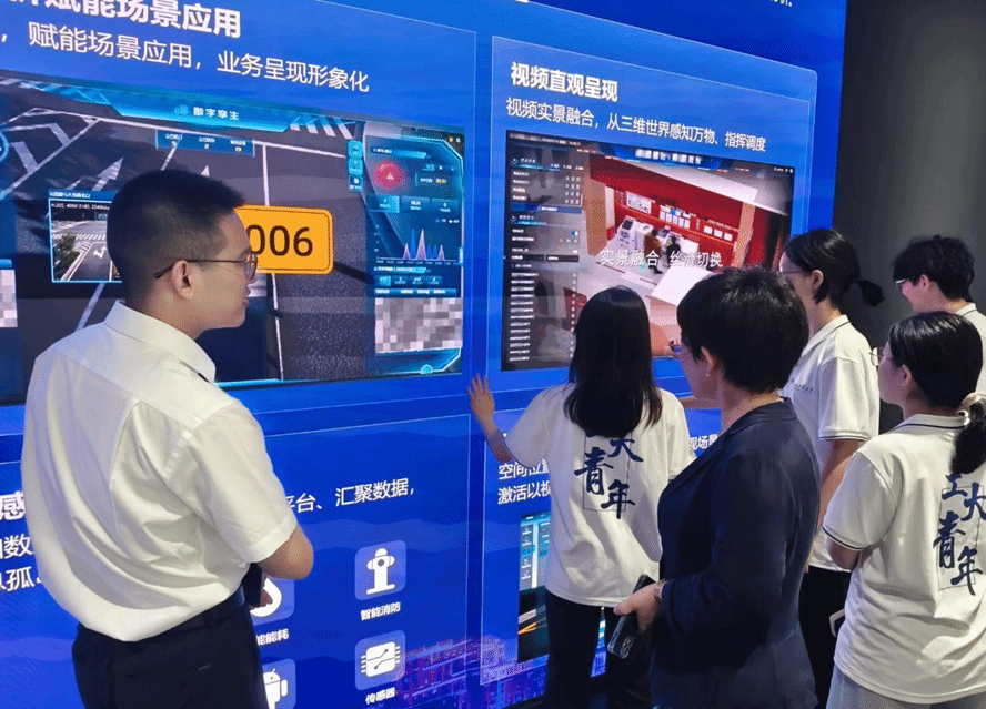 实践队首站走进展厅序厅,通过动态影像与数据图表,系统了解大华公司的发展历程。从最初以视频监控为核心的研究方向,到如今构建“AI+IoT”全生态体系,大华每年大量投入研发资金,实现了从硬件制造商向智能解决方案提供商的跨越式转型。
