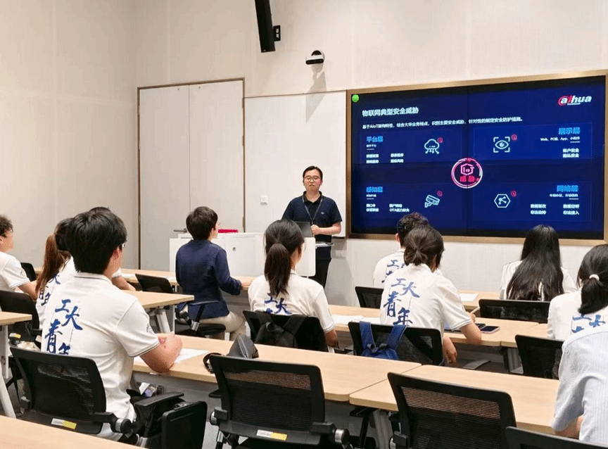随后网络空间安全首席科学家张剑青以《构建产品内生安全,实现端到端安全可信》为主题,带来一场精彩纷呈的前沿技术分享会。张教授从物联网安全威胁的四大层级切入,结合真实案例剖析了平台层数据泄露、展示层接口攻击、感知层设备入侵、网络层通信劫持等典型风险。讲座尾声,他以“让社会更安全,让生活更智能”的愿景寄语实践队员,激发了同学们对行业未来发展的思考与热情。