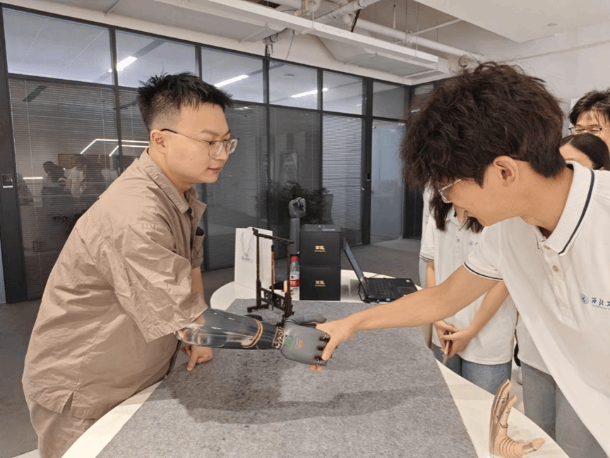 实践队首站抵达强脑科技。在工作人员引导下,队员们不仅触摸到了全球领先的脑机接口产品,更深入理解了这些技术如何切实改变残疾人及特殊群体的生活。无论是“开星果”脑机接口社交沟通训练系统帮助自闭症儿童更好地融入社会,还是一位残障工作人员现场用灵巧的机械仿生手弹奏出动人的钢琴曲,都向实践队员们生动诠释着“科技向善”的力量和温度。