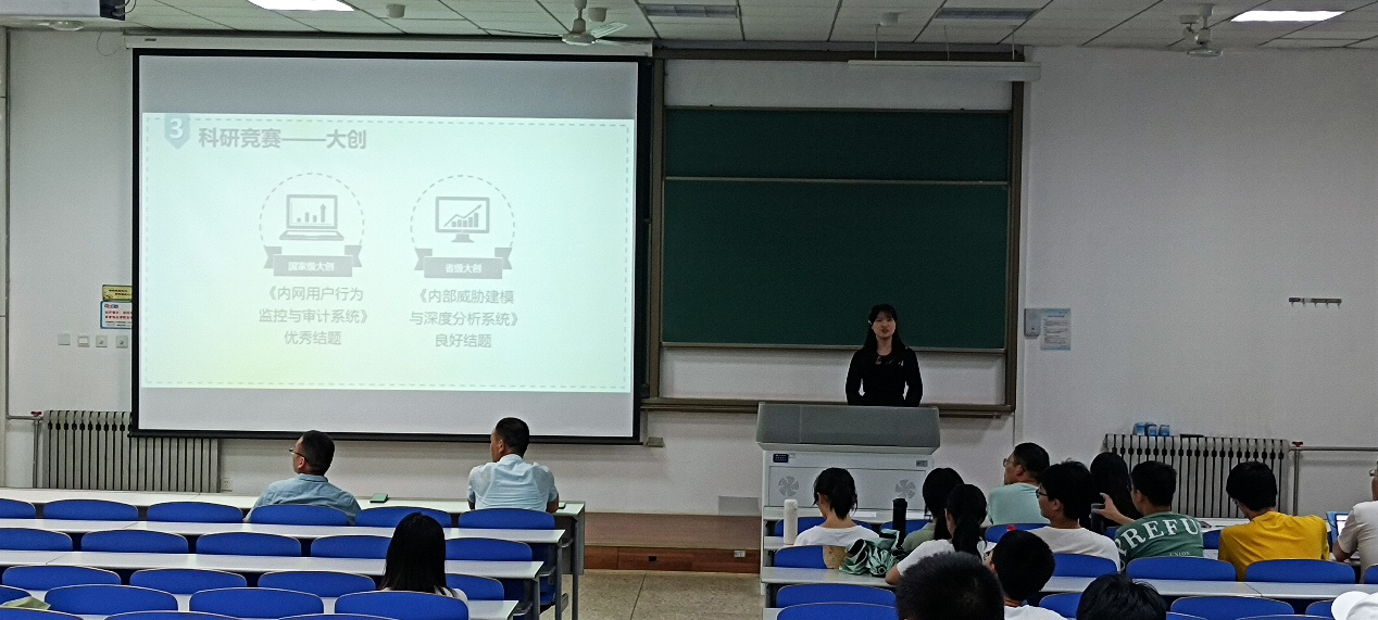 首先进行分享的是刘天珞学姐,她从课程学习、软著申报、大创、各类竞赛以及信息安全协会五个方面介绍了自己的经验和经历;重点介绍了自己参与老员工创新创业大赛的经历,为学弟学妹们在校如何进行综合能力提升打开了一片新的世界。