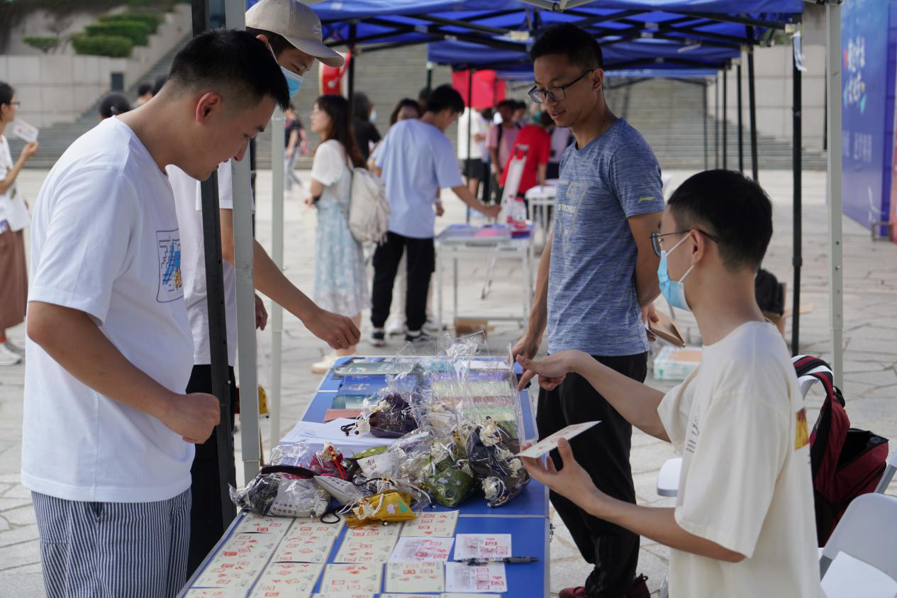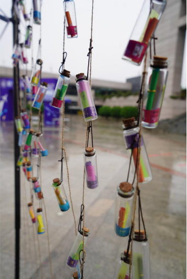 解忧漂流瓶活动中,大家则留下了对于学业、生活等方面的疑惑、问题,希望在同学们中寻找一个答案。大家对漂亮的漂流瓶都十分喜爱,参与活动同学们的漂流瓶变成了一串串风铃悬挂在活动帐篷上,成了翱翔员工中心广场的一道靓丽风景线。