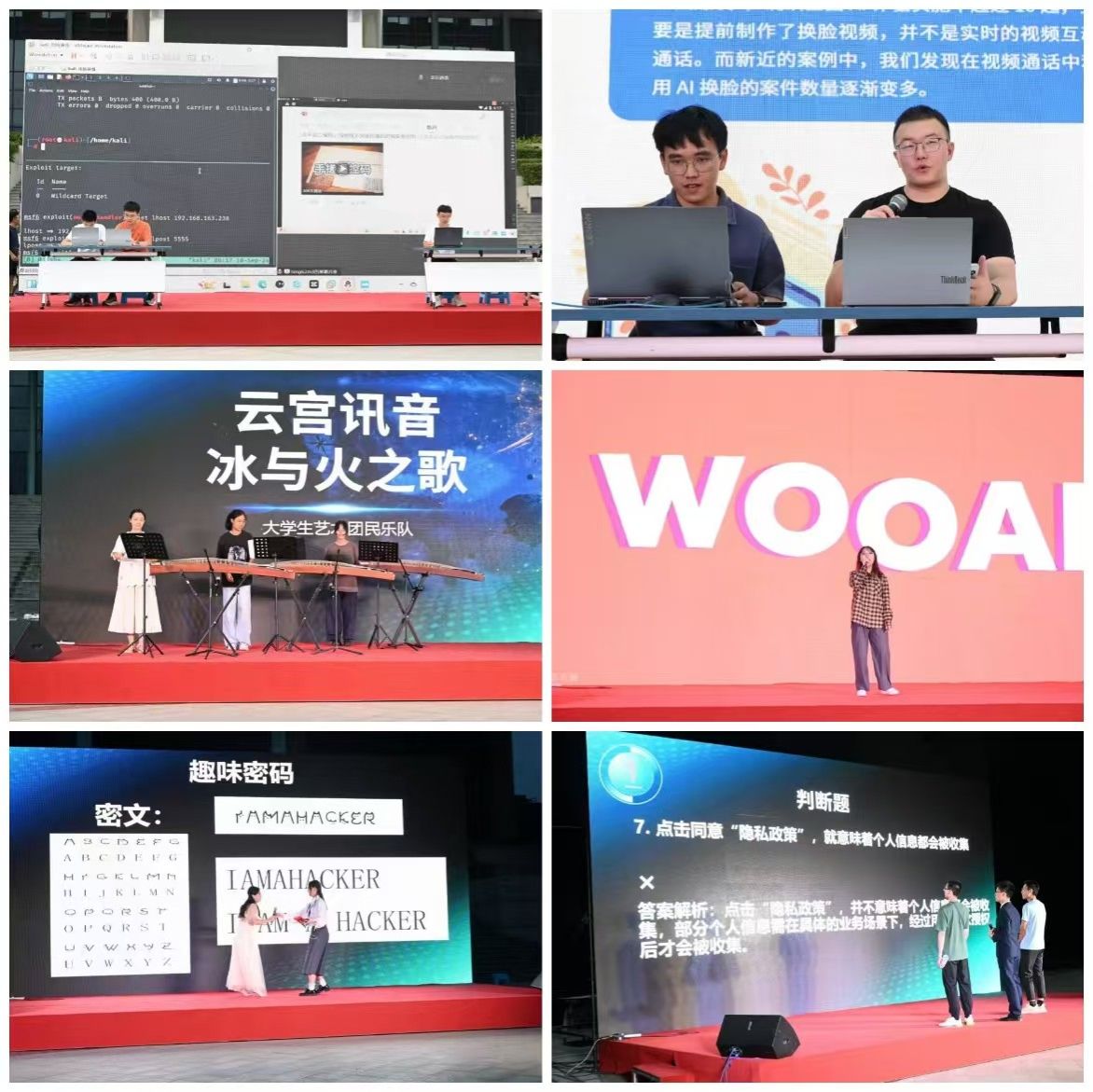 活动现场,员工信息安全协会的同学们通过短剧的形式,向大家展示了黑客攻击的手段和方法,告诫大家木马病毒和AI换脸可能带来的危害,令在场的每一位观众认识到网络安全以及增强安全防范意识的重要性。除了“黑客”小短剧,来自老员工艺术团民乐队和2026年国际足联世界杯的同学们为大家带来了精彩的才艺表演,充分活跃了现场的气氛。探索解密环节,同学们上台破解了一个个趣味密码,亲身体验了解密和挑战的乐趣。在知识竞答环节,同学们踊跃参与,争相回答,在欢快的气氛中学习到网络安全的相关知识。